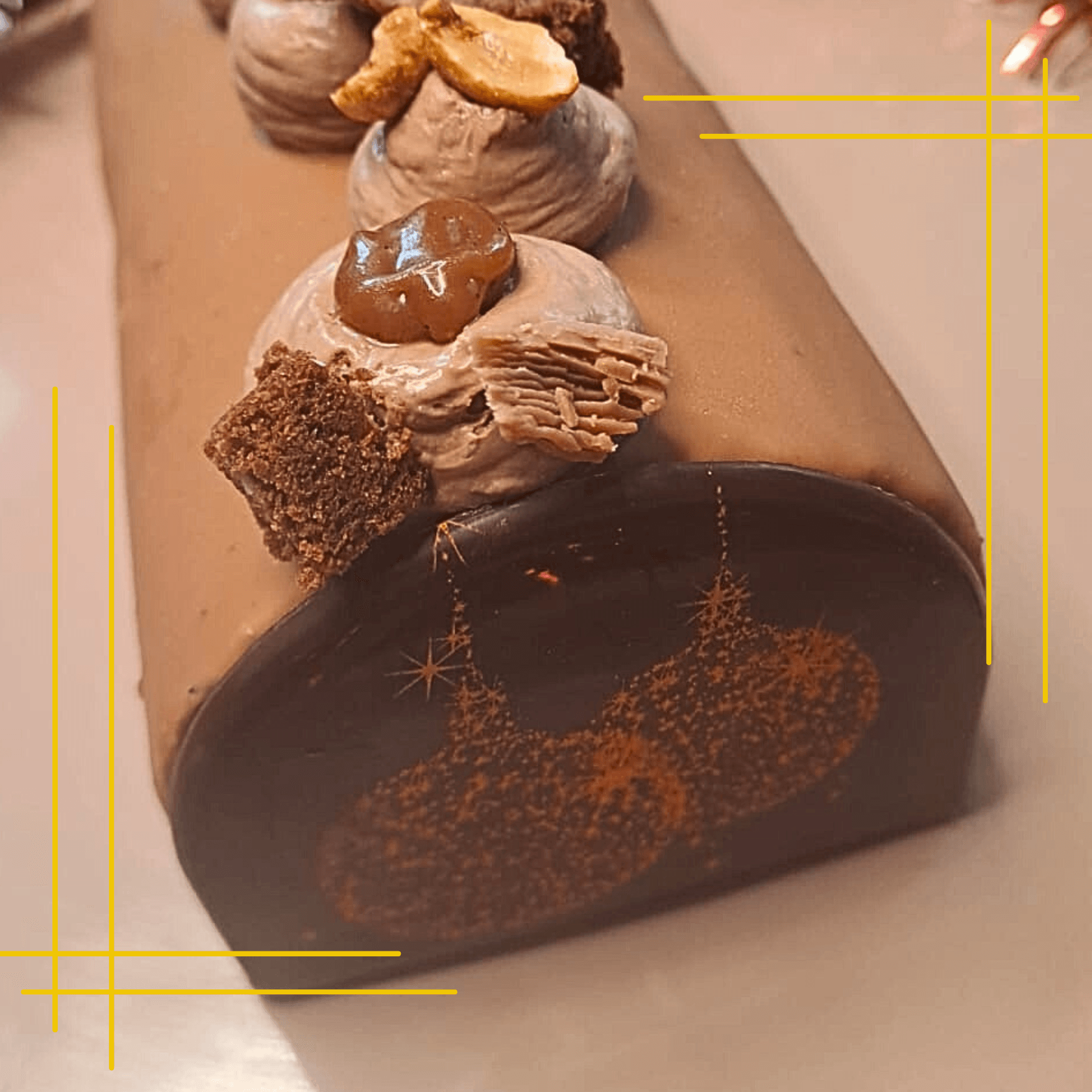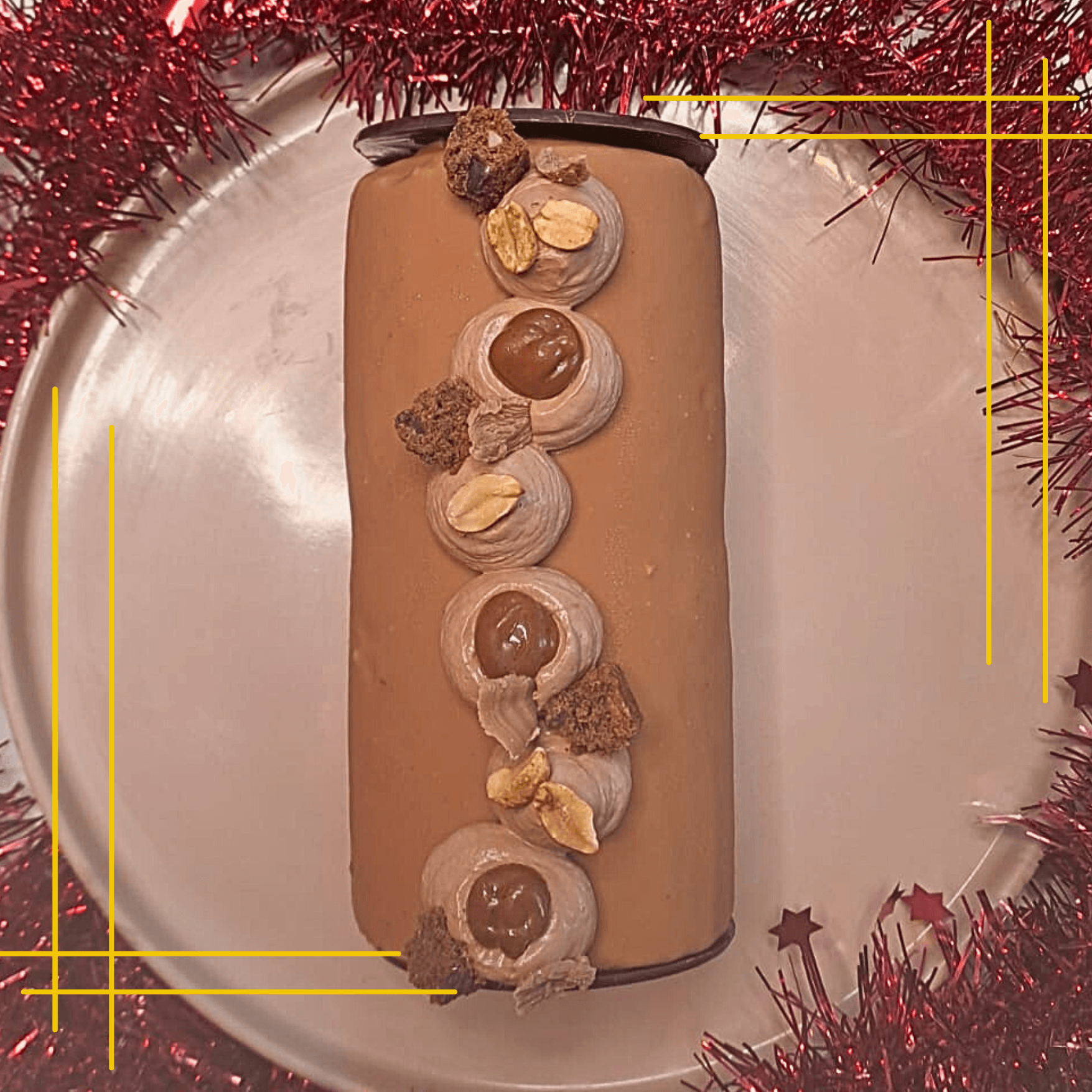 brownie chocolat éclats de cacahuètes, croustillant chocolat, mousse chocolat noir, caramel fleur de sel, cacahuètes entières, crémeux cacahuète, coque de chocolat caramélisé.